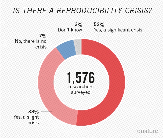 Over 1,500 researchers completed an online survey. As shown above, over half of the respondents thought there is a reproducibility crisis in science at present, while 38% thought the crisis is slight.