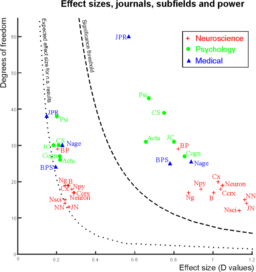 Figure 1: Median effect sizes and degrees of freedom. Journal abbreviations: Neuroscience: Nature Neuroscience (NN), Neuron, Brain (B), The Journal of Neuroscience (JN), Cerebral Cortex (Ccrx), NeuroImage (Ng), Cortex (Cx), Biological Psychology (BP), Neuropsychologia (NPy), Neuroscience (NSci). Psychology: Psychological Science (Psi), Cognitive Science (CS), Cognition (Cogn), Acta Psychologica (Acta), Journal of Experimental Child Psychology (JC). Medically oriented journals: Biological Psychiatry (BPS), Journal of Psychiatric Research (JPR), Neurobiology of Ageing (Nage). (Figure 4 in paper).