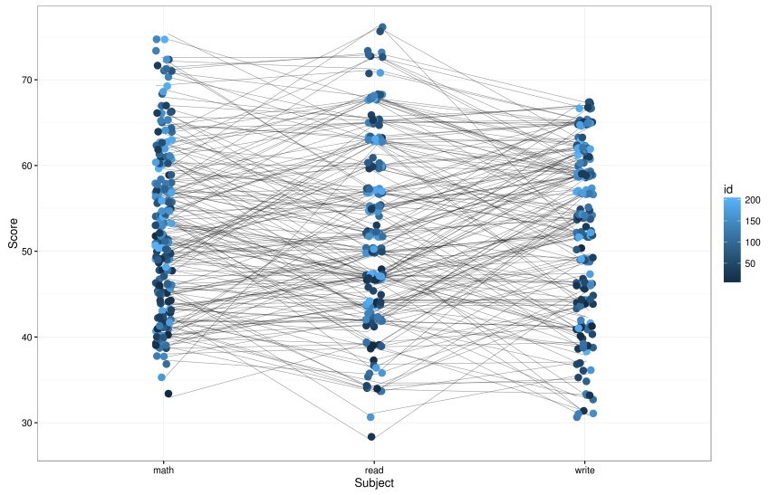 We reshape the data to long format and use ggplot2 to plot read, write and math scores for each subject. The reshape command for wide to long requires this information: