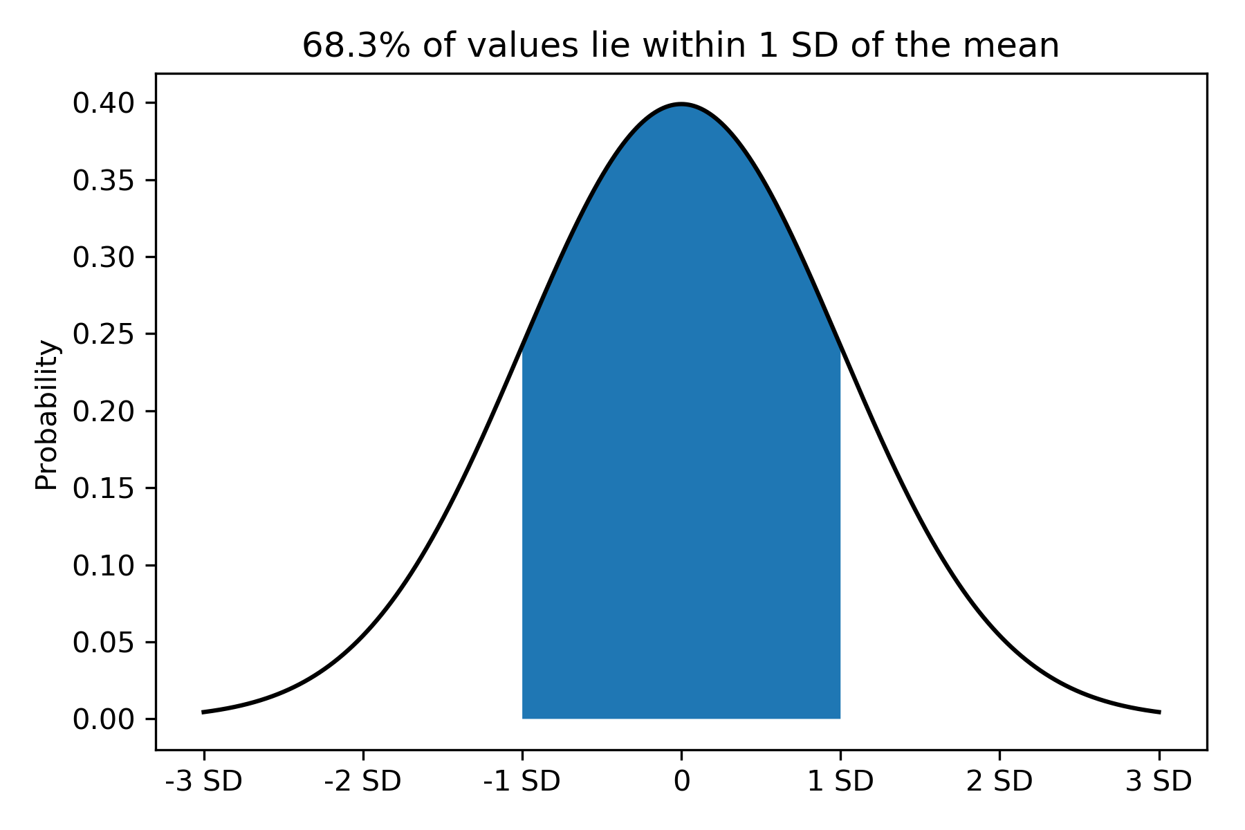 In the previous post, we learned how to calculate the standard deviation (SD) to quantify scatter of continuous data. How is the SD relevant to the Normal distribution? The SD is a measure of the spread of data in the distribution. We could quantify how much data lie within units of SDs from the mean. The following figures plot the probability density function of the data, and shades the area under the curve within units of SDs from the mean: