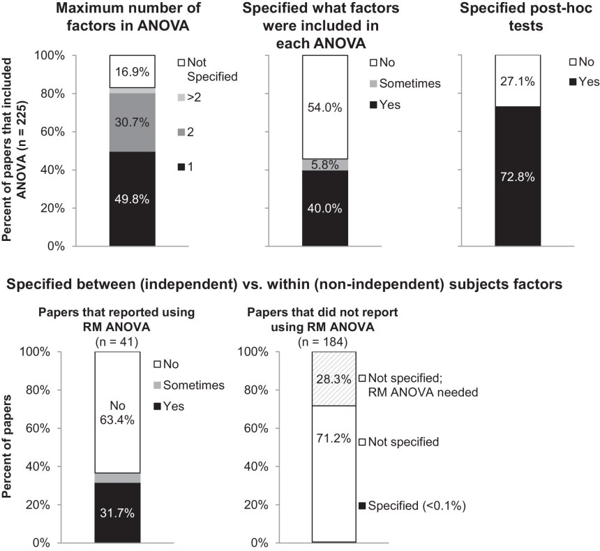 - Of the 41/225 (18.2%) papers that used repeated-measures ANOVA, 26/41 (63.4%) did not report whether each factor was between- or within-subjects.