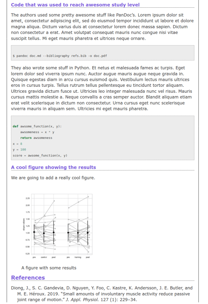 It is important to note that citations (and the resulting reference list) will only appear after we have processed our Markdown file using Pandoc. If we include citations in a README.md file on Github, we won’t see our citations and reference list, only the markup (i.e. [@diong_2019]).