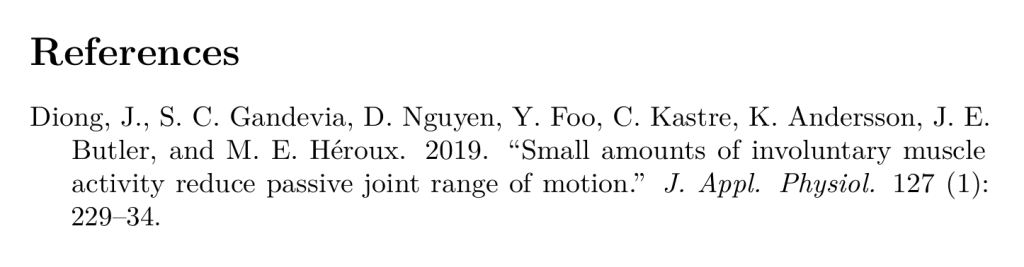 Finally, in our notes.md file, we can cite this paper in one of two ways. First, we can reference it like [@diong_2019]. This will result in the reference appearing in parentheses, like this: (Diong et al. 2019). We can also reference the paper without the square brackets, like this: @diong_2019. This will result in an in-line citation. That is, Diong et al. (2019). A reference list will also appear at the end of the document: