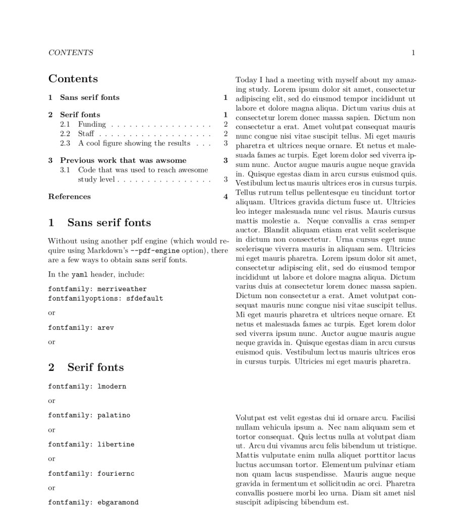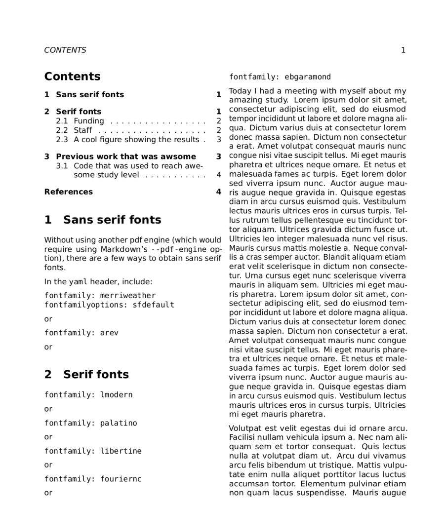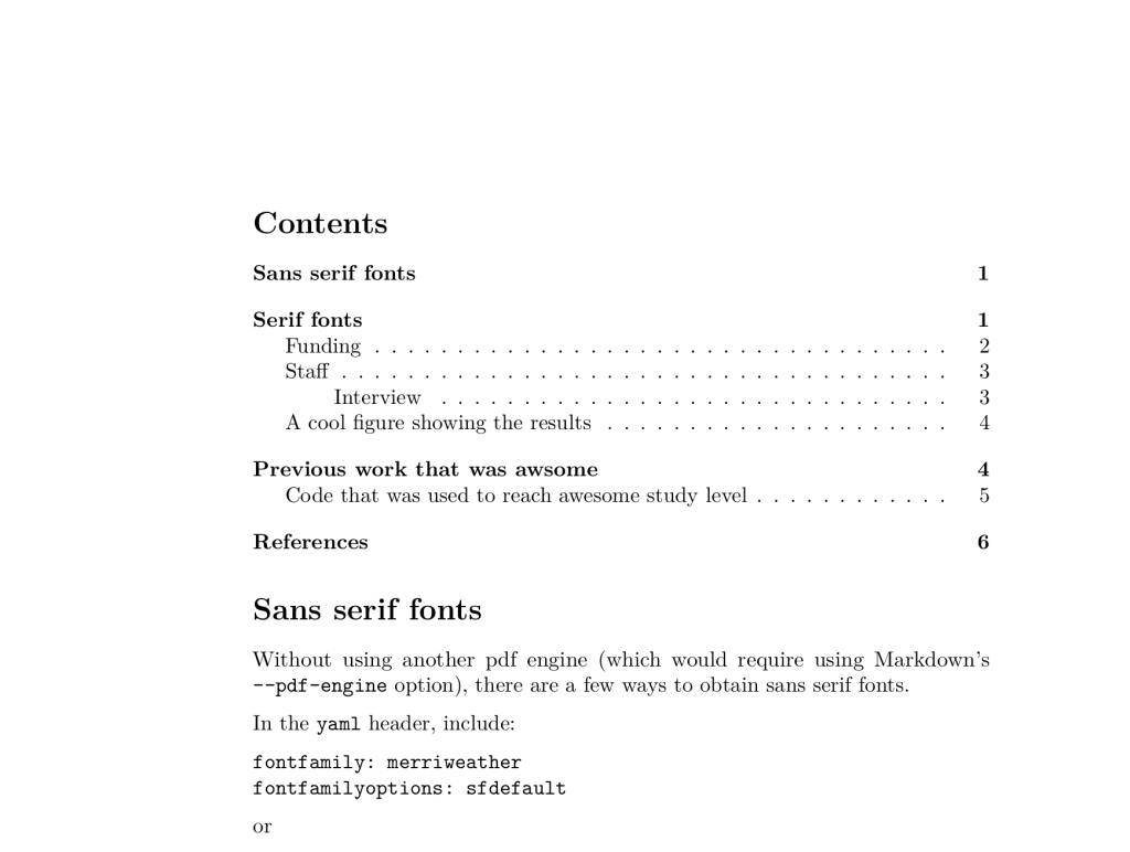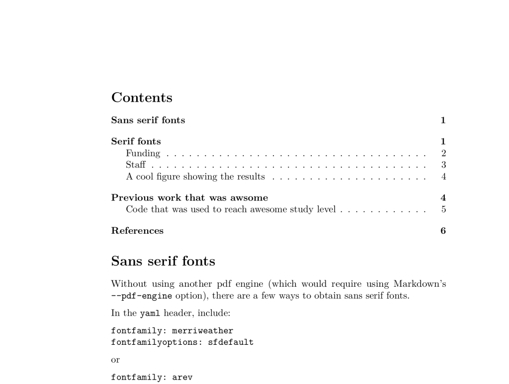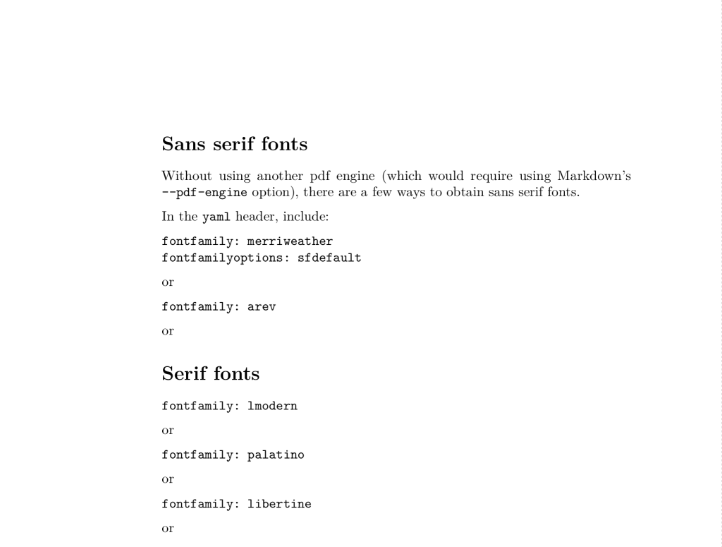 To provide a final example, we will apply one of the commands that appears in the document we have been generating. Specifically, we will add --variable fontfamily=arev to our command-line options to generate a document that uses a sans serif font: