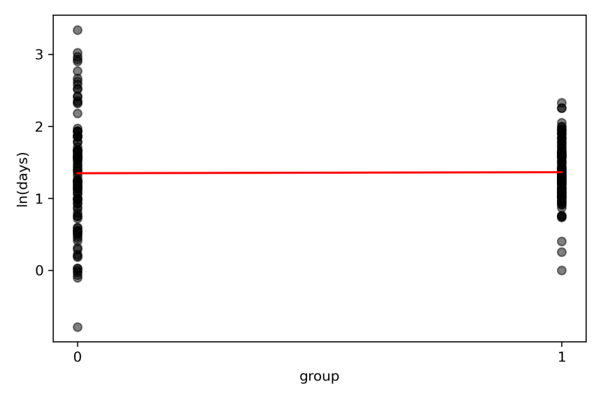 The red line is nearly flat, meaning that there is no difference between the means of log(days to discharge) between control and treated groups. Statsmodels reports this difference as the slope effect size 0.014 (95% CI -0.17 to 1.95). As expected, the 95% CI cross zero, meaning that 95 out of 100 confidence intervals of the mean between-group difference from repeated similar trials will also cross zero. So we infer that there is no difference in outcomes between control and treated groups. But the units of this effect and 95% CI are in log(days), and are less meaningful.