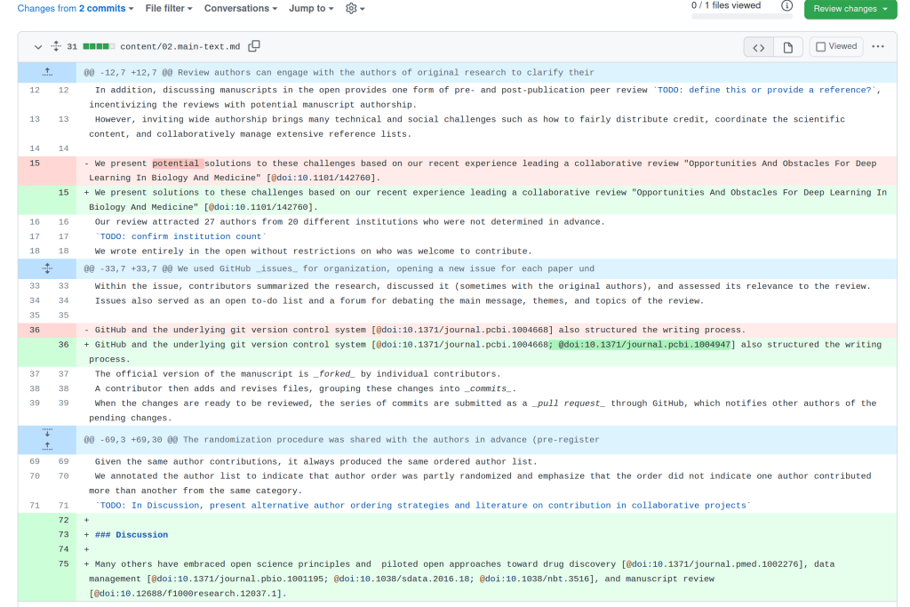 As mentioned above, Manubot papers are written in Markdown. The use of a simple, plain-text format such as Markdown has several advantages. Authors can use whatever text editor they want to work on their manuscripts. There is even the possibility of writing the paper directly on GitHub and its built-in editor. Also, plain-text makes it easy to use version control software, Git in this case, to track changes.