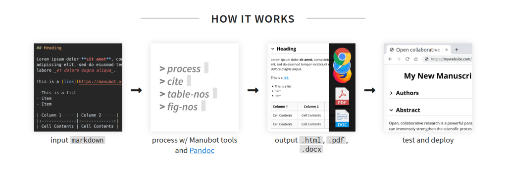 As might be expected, the authors used Manubot to write their paper on Manubot. The HTML and PDF versions of the paper that are automatically generated by Manubot can be viewed, and the GitHub repository used to write the manuscript using Manubot can be accessed here.