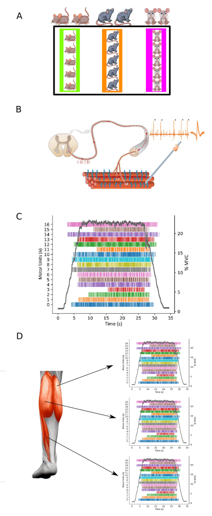 As a second example, researchers may want to record motor units because they provide information on the discharge activity of a motoneuron located in the spinal cord that innervates a given set of muscle fibres. Historically, this was a difficult and invasive procedure, requiring needle or fine-wire electrodes to be inserted into the muscle. As can be seen in Figure 2B, these types of recordings could be used to identify the unique shape of a motor unit – its motor unit action potential – and track its activity over time. At times, more than one motor unit could be identified at the same time. Alternatively, the recording electrode could be moved to a new location in the muscle and new motor units recorded. A modern solution is to use a grid of several dozen surface electrodes and use sophisticated algorithms to extract the discharge activity of the motor units contributing to the multi-unit surface recordings. As can be seen in Figure 2C, grid electrodes can capture the activity of dozens of motor units simultaneously.