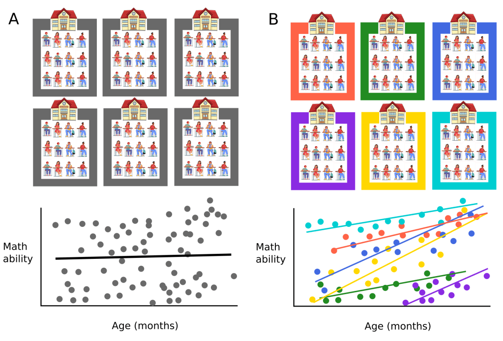 Schools, students and maths. Imagine we were trying to determine whether a student’s age in months impacts their maths ability. Could it be that students that are 8 years and 6 months old at the start of 3rd grade have better maths ability than students that who were exactly 8 years old at the start of the study? To answer this question, we might randomly select several schools from our district and have students perform a maths tests. As we can see in Figure 1A, if we lump all the students together, disregarding that they attend different school, there appears to be a slight effect of ages in months and maths ability.