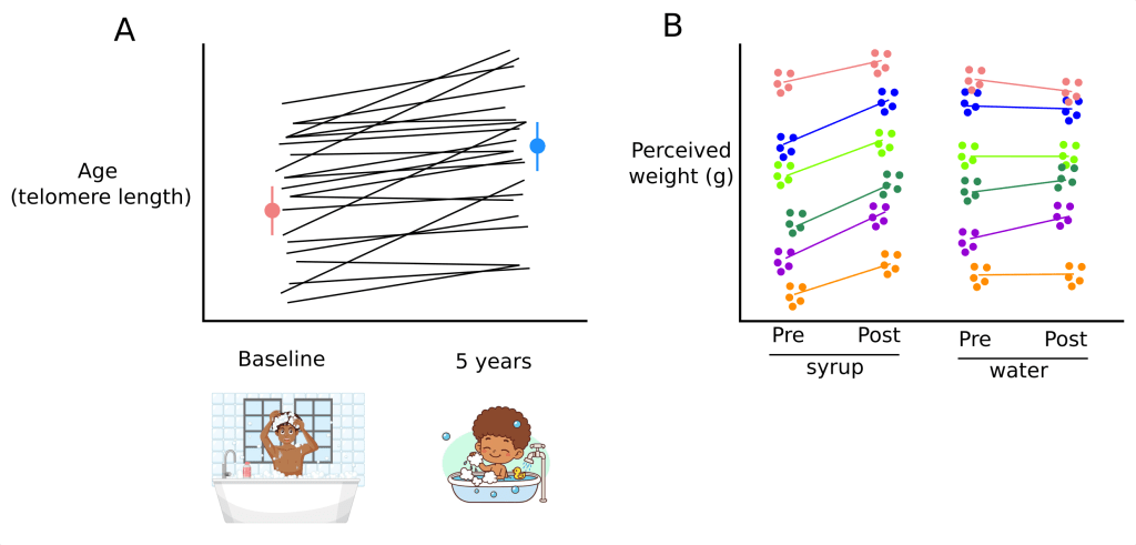 We can also see that a shot of maple syrup seems to make people report objects are heavier. But, as was the case for repeated trials at the ‘pre’ and ‘post’ time points, people who had higher ‘pre’ values also tended to have higher ‘post’ values. Thus, when analysing these data, we would have to account for the dependence of the multiple observations for a given participant at the ‘pre’ and ‘post’ periods, as well as the dependence between the ‘pre’ and ‘post’ observations within a given participant.