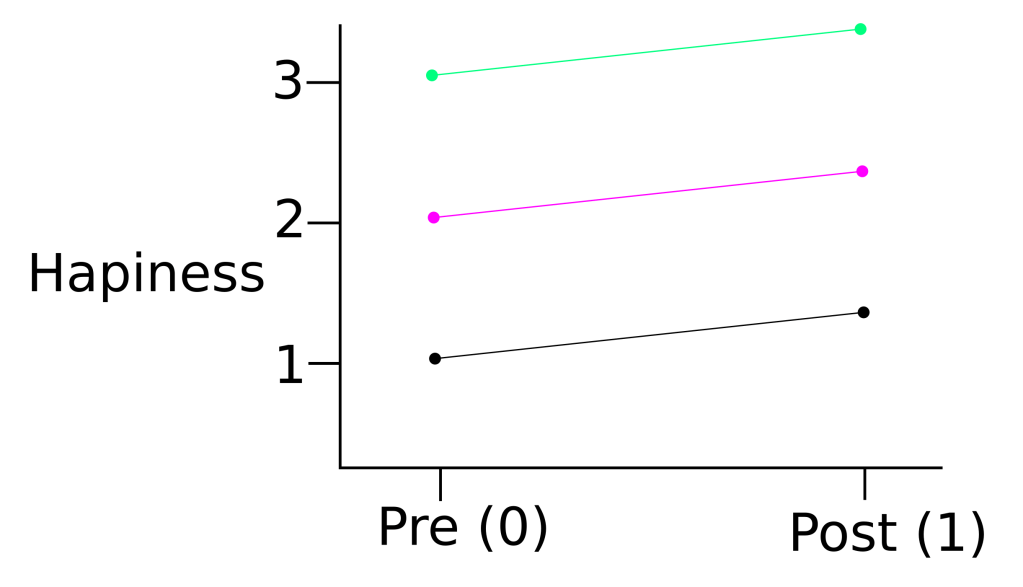 In this study, we measured peoples perceived happiness at the start of the study, and 2 months later, after sleeping on their maple pillow every night. An example of data from three of the study participants is presented in Figure 1.