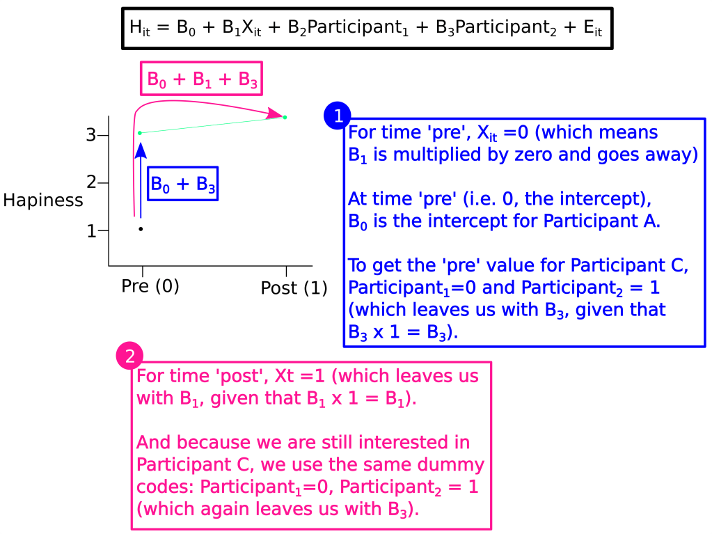 In case you did not follow what was going for Participant B and C, Figure 2 provides a visual explanation of how the ‘pre’ and ‘post’ data for Participant C are modeled.